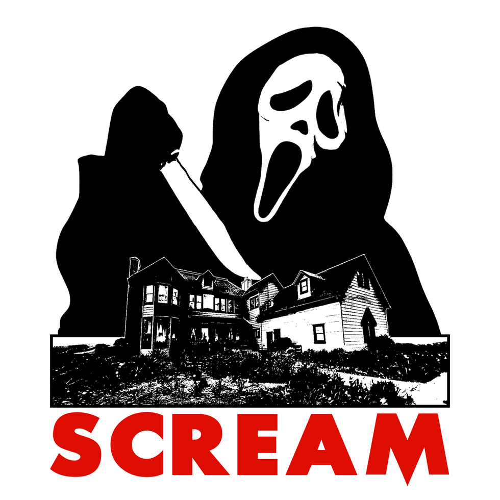 This is a T-shirt design featuring Ghostface and Stu Macher's House from "Scream (1996)"